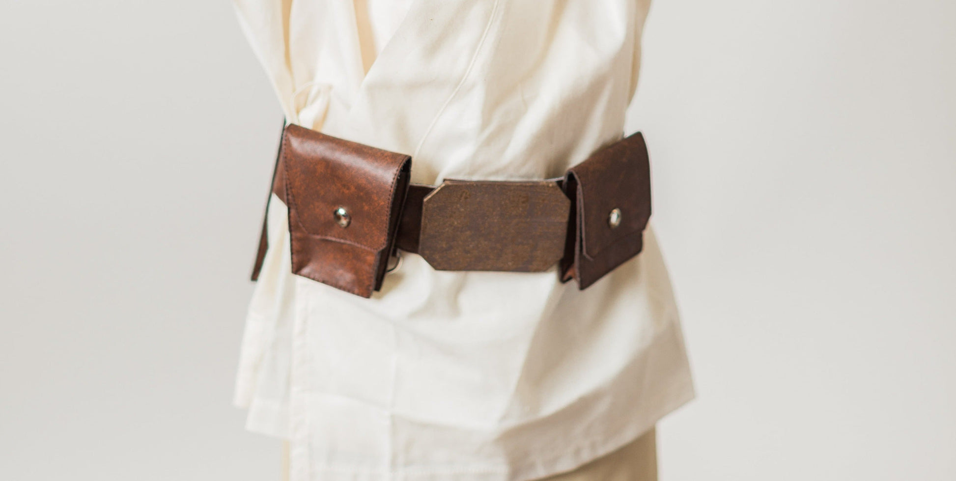 Furthermore, our Luke Skywalker costume comes with pants made of 100% cotton duck and an adjustable elastic waistband for maximum comfort during any activity. The brown faux upholstery belt features three convenient pouches, while the buckle boasts a distressed hand-painted finish and Velcro closure for easy adjustment.
